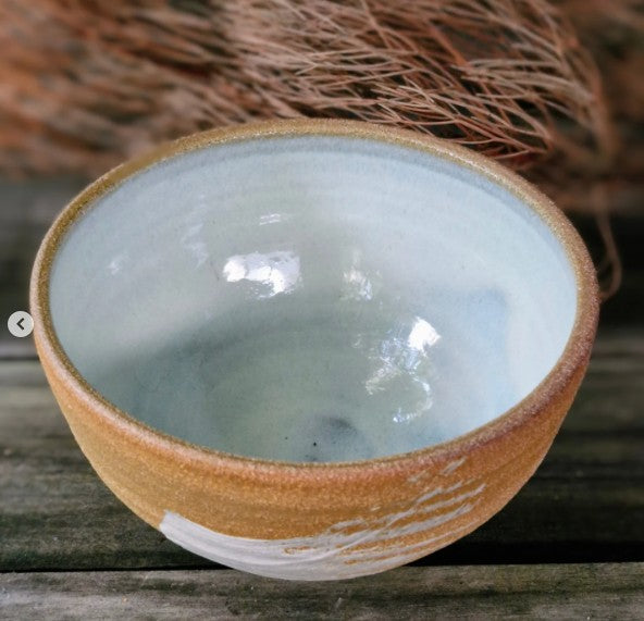 A simple swish of white slip onto the raw clay surface compliments the simplicity of this bowl. I wanted to leave the exterior unglazed to reveal the rawness, colour and texture of the clay and in contrast, use a shiny Chun glaze for the interior.